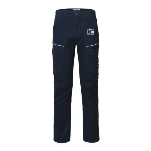 Pantalone da lavoro multitasca da donna in cotone twill elasticizzato, con elastici laterali e passanti in vita, chiusura con zip e bottone. Due tasche anteriori applicate a taglio classico con inserto di rinforzo a rilievo e fodera logata, ulteriore tasca davanti nella parte inferiore e tasca laterale porta metro sulla gamba sinistra, tasca laterale chiusa con aletta e velcro sulla gamba destra, due tasche posteriori applicate. Dettagli di tessuto a spina di pesce sulle tasche davanti e vicino al porta metro, triple cuciture al cavallo, pences alle ginocchia per maggior comfort. Profili orizzontali nel taglio delle tasche anteriori e 4 bande su tasca porta metro in tessuto rifrangente.