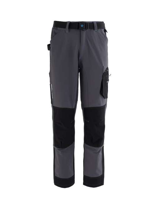 Pantalone da lavoro multistagione in tessuto stretch nelle quattro direzioni, leggero e traspirante, elastici laterali in vita e passanti, inserto in rete di colore a contrasto nella zona renale. Chiusura alla patta con zip e bottone in metallo con finitura effetto rame. Pratica cintura estraibile in poliestere, regolabile con fibbia a chiusura automatica. Inserto in poliestere sul fianco destro ed anello di plastica inserito sul fianco sinistro utili per appendere accessori e strumenti. Due ampie tasche anteriori, tasca laterale porta metro applicata su gamba destra con ulteriore taschino in tessuto Ripstop, tascone laterale applicato sulla gamba sinistra chiuso con zip waterproof e con ulteriori due taschini, uno in tessuto Ripstop ed uno in mesh di poliestere. Due tasche posteriori, una a destra chiusa con aletta e velcro, una a sinistra chiusa con zip waterproof. Tessuto Ripstop sul fondo gamba con profilo rifrangente orizzontale inserito nella cucitura. Cavallo con doppio tessuto e tripla cucitura. Rinforzi di tessuto Ripstop di colore a contrasto sulle ginocchia. Travette a contrasto, pences alle ginocchia per maggior comfort. WATER REPELLENT 20 LAVAGGI