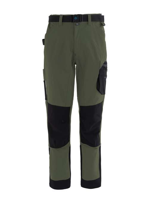 Pantalone da lavoro in tessuto stretch nelle quattro direzioni, ultraleggero e traspirante, elastici laterali in vita e passanti, inserto in rete di colore a contrasto nella zona renale. Chiusura alla patta con zip e bottone in metallo con finitura effetto rame. Pratica cintura estraibile in poliestere, regolabile con fibbia a chiusura automatica. Inserto in poliestere sul fianco destro ed anello di plastica inserito sul fianco sinistro utili per appendere accessori e strumenti. Due ampie tasche anteriori, tasca laterale porta metro applicata su gamba destra con ulteriore taschino in tessuto Ripstop, tascone laterale applicato sulla gamba sinistra chiuso con zip e con ulteriori due taschini, uno in tessuto Ripstop ed uno in mesh di poliestere. Due tasche posteriori, una a destra chiusa con aletta e velcro, una a sinistra chiusa con zip. Tessuto Ripstop sul fondo gamba con profilo rifrangente orizzontale inserito nella cucitura. Cavallo con doppio tessuto e tripla cucitura. Rinforzi di tessuto Ripstop di colore a contrasto sulle ginocchia. Travette a contrasto, pences alle ginocchia per maggior comfort.