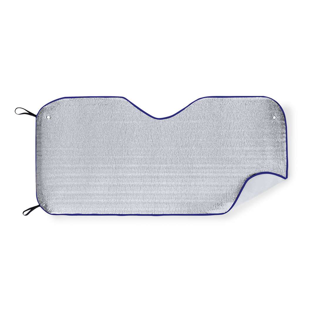 Parasole monofacciale in alluminio di colore argento con finitura metallica e profili in poliestere in colori vivaci. Dimensioni 130x60cm e schiuma sul retro. Cinghie di regolazione elastiche con anelli di rinforzo in metallo, due ventose per la regolazione sul lunotto e spedito steso per una facile stampa.