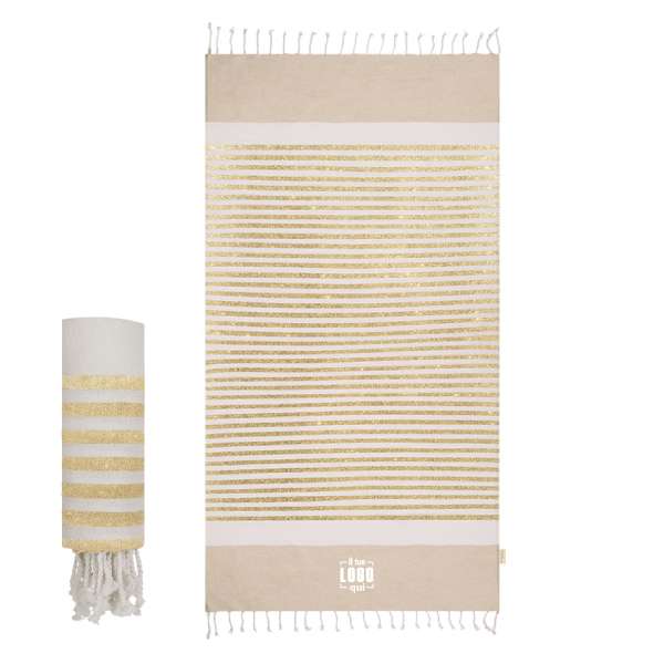 Pareo Asciugamano in cotone riciclato di 180g/m2. Design a righe bianche in combinazione con righe dorate effetto glitter estremità in beige liscio e distintivi frange agli estremi a forma di corda. Include etichetta con distintivo cotone riciclato.