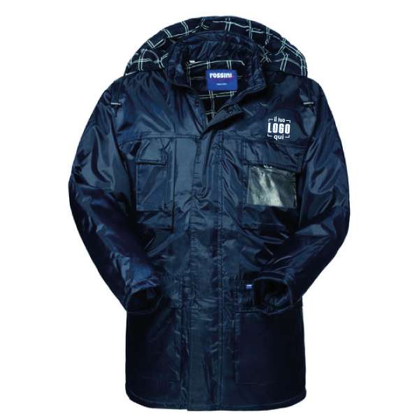 Parka imbottito con chiusura con cerniera coperta da patta chiusa con bottoni automatici nascosti, cappuccio staccabile imbottito con fodera di flanella di colore blu a quadretti bianchi e cordino regolabile. Un taschino a soffietto applicato sul petto destro chiuso con velcro, un taschino lato destro chiuso con cerniera verticale, un taschino a soffietto anteriore applicato chiuso con aletta e bottoni automatici nascosti, un taschino interno applicato,due tasche a soffietto chiuse con aletta e bottoni automatici nascosti, un portabadge in PVC removibile. Fondo manica con polso interno in maglina, fori di aerazione sotto le ascelle, elastico in vita.