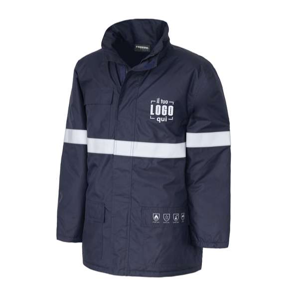 Parka imbottito con chiusura centrale con zip coperta da coprizip chiuso con punti velcro, collo alto, cappuccio regolabile da coulisse richiudibile nel collo con chiusura in velcro. Un taschino applicato al petto destro chiuso con velcro. Etichetta interna con registro numero lavaggi e dati personali, un taschino a filetto chiuso con punto velcro nella parte interna del petto sinistro, polso regolabile con velcro. Due tasconi inferiori coperti da aletta, polso interno elasticizzato per maggiore comfort e protezione. Strisce rifrangenti anteriori e posteriori.