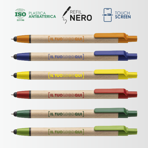Penna a sfera ecologica con gommino per touch screen, perfetta per scrivere su carta o dispositivi digitali. Meccanismo a scatto e corpo in carta naturale, abbinato a minuterie in plastica colorata per un tocco vivace. Inchiostro nero. Ideale per promozioni green e gadget aziendali sostenibili. Personalizzabile con stampa tampografica, serigrafica o UV (se supportata dal materiale).
