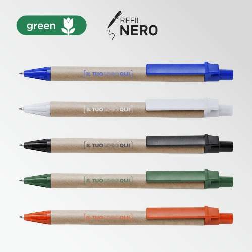 Dal design creativo e sostenibile, questa penna a pulsante è realizzata con un fusto in cartone riciclato e accessori in colori brillanti, perfetta per dare un tocco di allegria alla scrittura quotidiana. L'inchiostro nero la rende adatta a uso professionale, scolastico e promozionale.