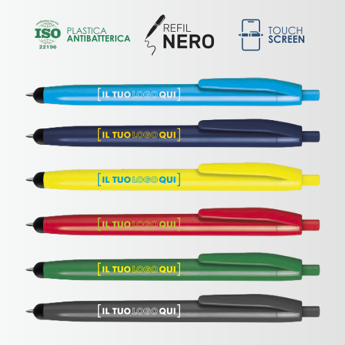 Penna a sfera 2-in-1 con pratico gommino per touch screen, perfetta per scrivere su carta o su dispositivi digitali. Meccanismo a scatto, corpo in plastica colorata resistente e inchiostro nero. Ideale per gadget promozionali grazie alla possibilità di personalizzazione con stampa serigrafica, tampografica o UV.