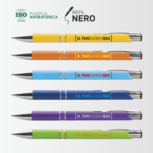 Penna a sfera con meccanismo a scatto, corpo in plastica colorata resistente e minuterie in metallo cromato per un tocco elegante. Refill jumbo con sfera al tungsteno per una scrittura fluida e duratura. Inchiostro nero. Ideale per gadget aziendali, eventi e promozioni. Personalizzabile con stampa serigrafica, tampografica o UV.