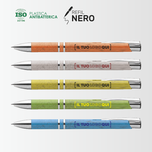 Penna a sfera eco-friendly con fusto realizzato in fibre di paglia di frumento e plastica, dotata di meccanismo a scatto e minuterie cromate per un look moderno e sostenibile. Refill con inchiostro nero per una scrittura scorrevole. Perfetta per aziende attente all’ambiente, personalizzabile con stampa serigrafica, tampografica o UV.