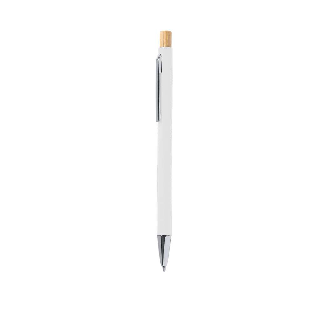 Penna a sfera con meccanismo a pulsante realizzata in alluminio riciclato. Pulsante in bambù e corpo con finitura in gomma opaca. Clip metallica e distintivo di alluminio riciclato nella parte superiore della penna, in inchiostro blu.L'alluminio riciclato è un materiale con possibilità di riciclaggio quasi infinite, senza perdere le sue proprietà originali e consumando meno energia in questo processo.Certificazione GRS (Global Recycled Standard / Standard di Riciclaggio Globale), che garantisce l'origine riciclata del materiale utilizzato per fabbricare il prodotto.Materiali come il Bambù promuovono l'uso di materie prime naturali riducendo le emissioni inquinanti. Inoltre, il bambù proviene da una pianta di grande resistenza e versatilità, con crescita e rigenerazione rapide, costituendo un'ottima alternativa all'uso del legno tradizionale.Cartuccia Jumbo