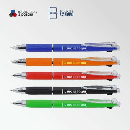 Pratica e colorata, questa penna touch a pulsante è un gadget multifunzione con inchiostro selezionabile tra blu, rosso o matita meccanica. Il fusto è disponibile in una vivace gamma di colori con impugnatura soft-touch e parte superiore gommata, per una scrittura fluida e confortevole. La clip e la punta trasparente aggiungono un tocco moderno al design. Ogni funzione ha il proprio pulsante abbinato, rendendola ideale per chi cerca uno strumento pratico e versatile.