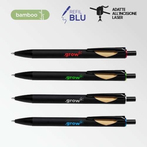 Questa penna a pulsante presenta un fusto in finitura nera solida con dettagli colorati sulla parte superiore e una clip in metallo nero impreziosita da un inserto in bambù . Il suo rivestimento speciale è stato appositamente progettato per ottenere una personalizzazione laser precisa e coordinata, rendendola un gadget ideale per valorizzare il tuo logo aziendale. Dotata di inchiostro blu, è presentata in un sacchetto individuale riciclato ♻️, che sottolinea l’impegno green. Il bambù, materiale naturale e a rapida rigenerazione, contribuisce a ridurre le emissioni inquinanti e rappresenta un’ottima alternativa al legno tradizionale.