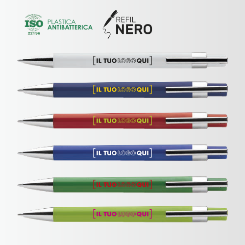 Penna a sfera con meccanismo a scatto, corpo in plastica colorata e minuterie in metallo cromato per un look professionale. Dotata di refill jumbo con sfera al tungsteno e inchiostro nero, garantisce una scrittura fluida e duratura. Ideale come gadget aziendale personalizzato con stampa serigrafica, tampografica o UV.