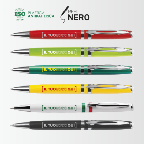 Penna a sfera elegante con meccanismo a rotazione, corpo in plastica colorata e minuterie in metallo cromato. Refill di qualità con sfera al tungsteno per una scrittura precisa e fluida. Inchiostro nero. Ideale per personalizzazioni aziendali con stampa serigrafica, tampografica o UV.