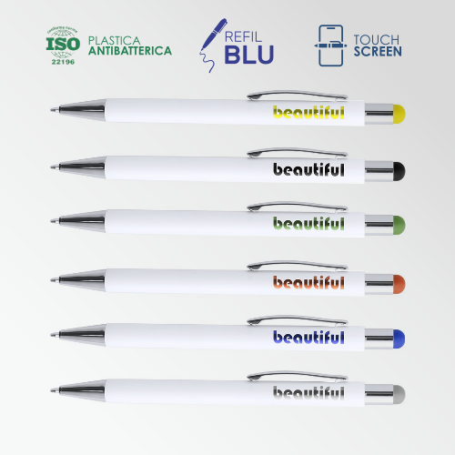 Elegante penna touch con meccanismo a pulsante e fusto in alluminio bianco opaco. Il puntatore touch è disponibile in vari colori coordinati con l'interno della penna. Gli elementi cromati donano un tocco premium al design. Il rivestimento esterno è progettato per incisioni laser precise, ideali per loghi e pubblicità in tinta con l'interno. Dotata di cartuccia Jumbo con inchiostro blu.
