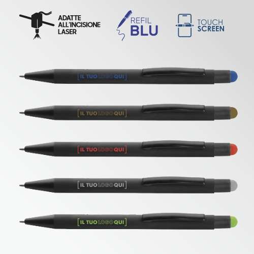 Penna a sfera con funzione touch screen e meccanismo a rotazione, caratterizzata da un design professionale con corpo nero opaco e pulsante touch in diversi colori. La clip in metallo nero completa l'estetica elegante, mentre il rivestimento esterno speciale è studiato per ottenere un'incisione laser precisa e di grande effetto, abbinata cromaticamente al colore del puntatore. Dotata di cartuccia Jumbo con inchiostro blu per una scrittura fluida e duratura.