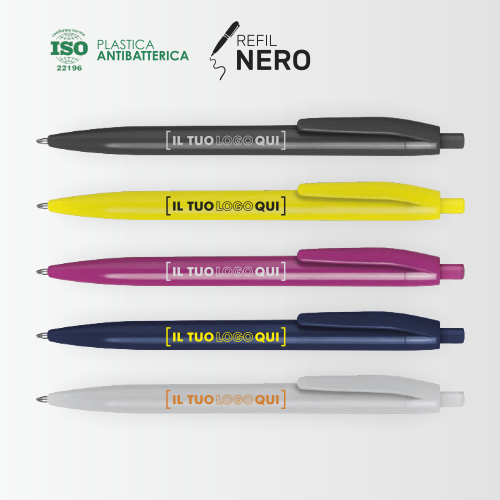 Questa penna a sfera con corpo colorato antibatterico è perfetta per ambienti professionali, scolastici e sanitari. Un gadget promozionale efficace e sicuro da personalizzare.