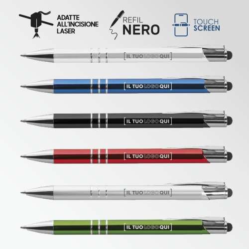 Penna a sfera dal design moderno con corpo in alluminio leggero e resistente. Dotata di gommino per schermi touch, meccanismo a scatto e minuterie in metallo cromato. Refill jumbo con sfera al tungsteno e inchiostro nero per una scrittura fluida e duratura. Ideale per personalizzazioni aziendali di classe.