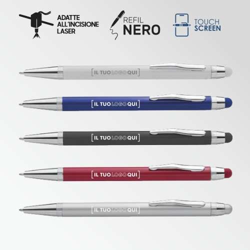 Penna a sfera dallo stile elegante, con meccanismo a rotazione, corpo in lacca lucida e minuterie in metallo cromato per un effetto brillante e raffinato. Dotata di gommino touch screen, è perfetta per l’uso su dispositivi digitali come smartphone e tablet. L’inchiostro nero assicura una scrittura fluida e professionale. Ideale per personalizzazioni aziendali tramite serigrafia, tampografia, incisione laser o stampa UV.