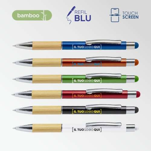 Elegante penna a rotazione realizzata in bambù naturale e alluminio, perfetta per chi cerca un gadget sostenibile ma con un design raffinato. Il fusto in alluminio lucido, disponibile in vari colori esclusivi, si abbina all'impugnatura in bambù, mentre il puntatore touch è integrato sulla parte superiore. Dotata di clip in metallo e inchiostro blu, viene fornita in un astuccio individuale riciclato. Il bambù è una risorsa eco-friendly: cresce rapidamente, è resistente e rappresenta un'alternativa sostenibile al legno tradizionale, contribuendo alla riduzione delle emissioni inquinanti.