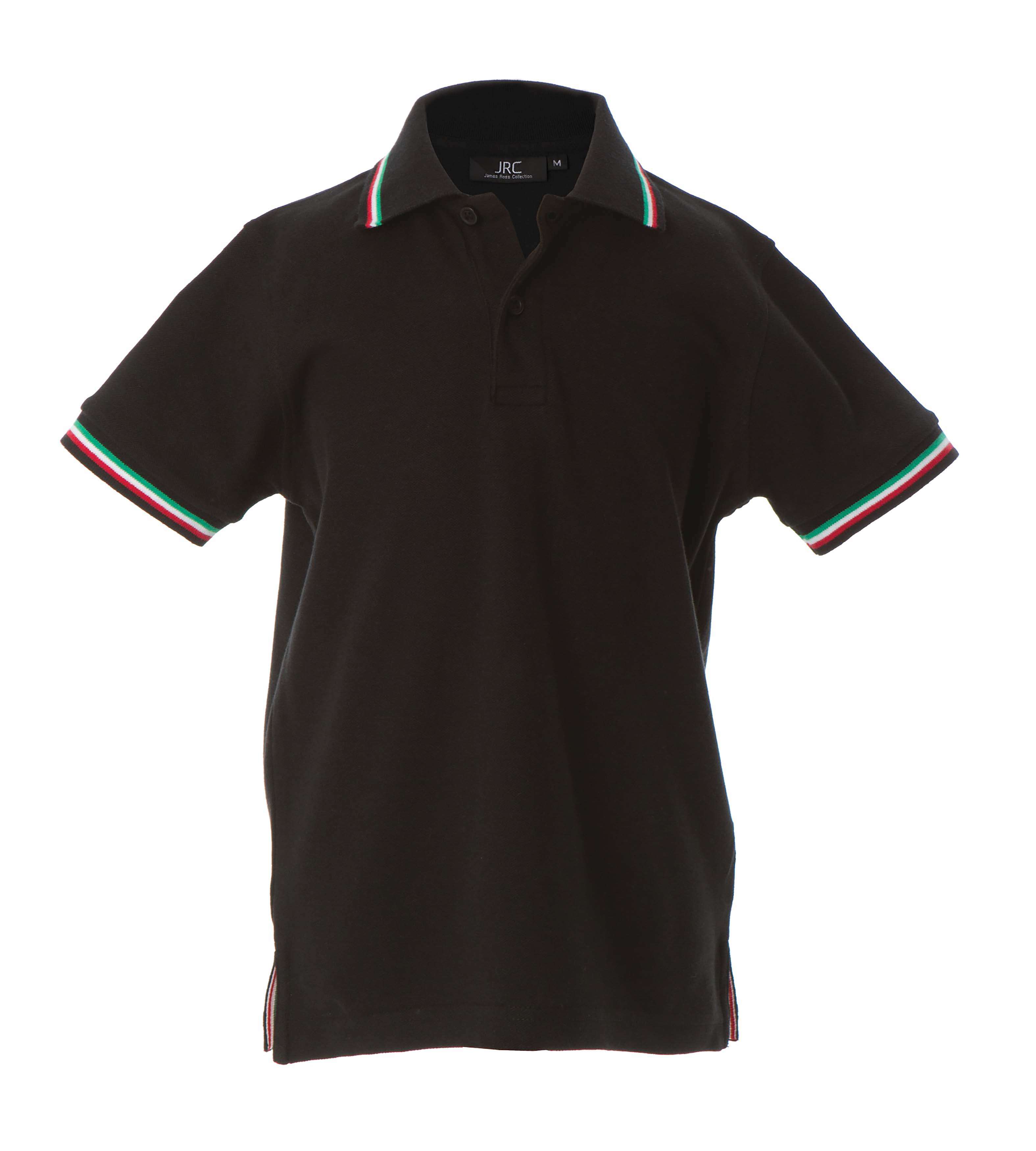 - Doppio piping tricolore su colletto e fondo manica in rib
