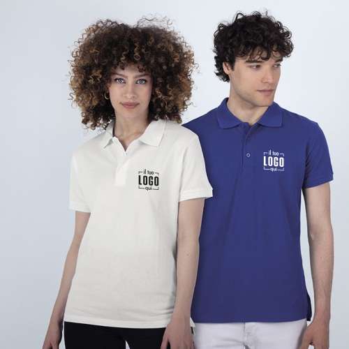 polo mezza manica cotone piquet pettinato, bianco ; 3 bottoni ; ribattitura doppio ago su collo, maniche e orlo ; nastro di rinforzo interno ; spacchi laterali ; bottone di ricambio incluso ; colori reattivi ; 180 g/m2
