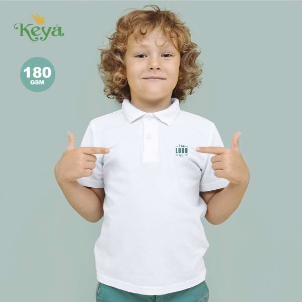 Polo Keya bambino in piqué 100% cotone da 180g/m². Due bottoni tono su tono, taglio comodo e disponibile in bianco. Taglie da XS a XL.