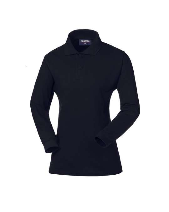 Polo manica lunga da donna con polsino in maglia, rinforzo sulla parte posteriore del collo con fascia parasudore interna, collo chiuso con due bottoni, spacchetti al fondo.