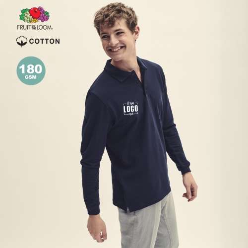 Polo adulto a manica lunga Premium Long Sleeve di Fruit Of The Loom. Realizzata in 100% cotone 180g/m2, con una sensazione di morbidezza e un taglio classico. Con spacchetti laterali per una vestibilità ottimale, abbottonatura a tre bottoni con tintura in tinta e polsini in cotone/elastan.