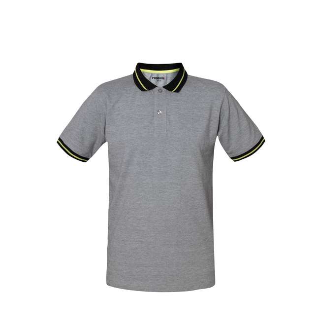 Polo mezza manica con fascia parasudore interna e collo di colore in contrasto chiuso con due bottoni, giromanica a costina con profilo di colore in contrasto, spacchetti laterali al fondo con inserto di colore in contrasto.