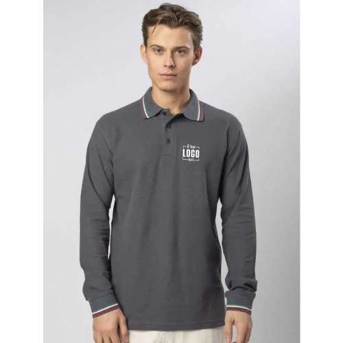Polo Uomo Manica Lunga in Cotone Piquè, 3 Bottoni e Bordature Tricolore Personalizzata Ideale come Capo Promozionale-Italy L/S