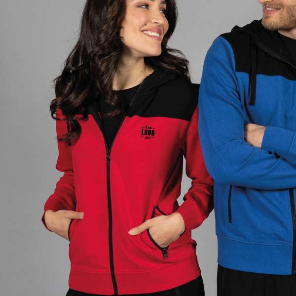 FELPA 80% COTONE - 20% POLIESTEREIN FRENCH TERRY- Non felpata internamente- Spalle e cappuccio in contrasto- Cappuccio con cordini- Colletto rialzato- Zip lunga nastrata in contrasto- Due tasche con zip nastrate in contrasto- Polsini e fondo maglia in costina elasticizzata- Nastro di rinforzo interno collo- Cuciture ribattute- Il colore Melange è 60% cotone 40% polyestere