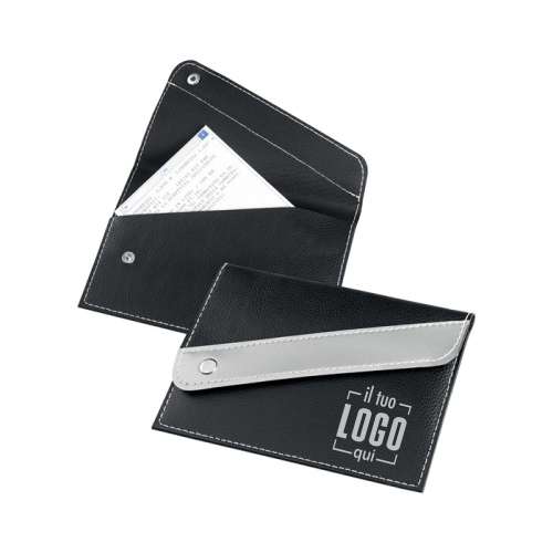 Portadocumenti in PVC con chiusura a pattina e marcatura neutra a secco. Personalizzazione serigrafica e UV disponibile. Sicuro, elegante e pratico per i tuoi documenti.