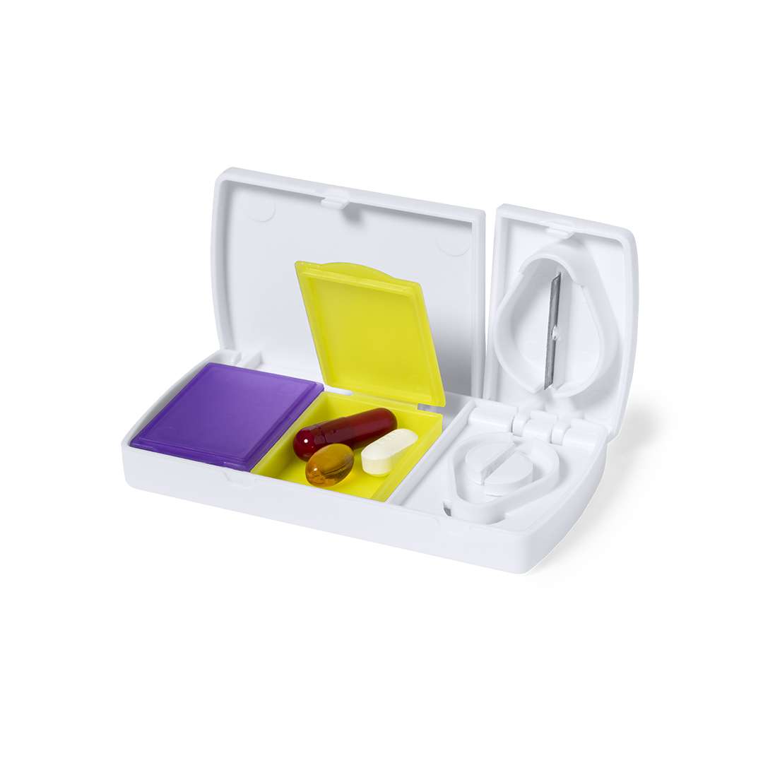 Portapillole realizzato in materiale resistente e compatto, con finitura bianca. Con 2 sezioni interne, chiusura di sicurezza e lama per dividere le pillole.
