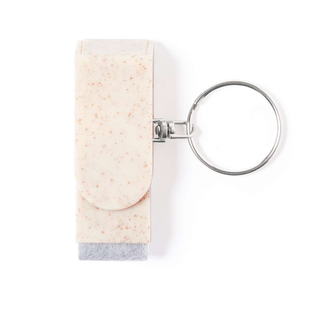 Un gadget ecologico e multifunzione! Realizzato in fibra di grano, questo portachiavi combina praticità e sostenibilità. Dotato di meccanismo girevole che funge da supporto per smartphone e accessorio pulisci schermo integrato, è l’ideale per chi cerca un oggetto utile, compatto e rispettoso dell’ambiente.