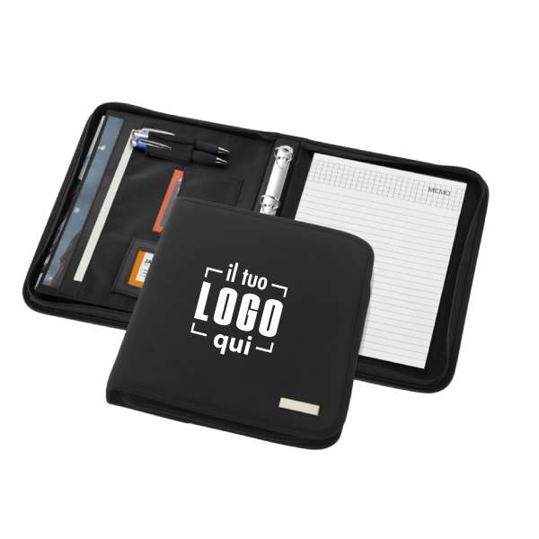 Cartella porta blocco in poliestere con 4 tasche interne e porta biglietto trasparente.