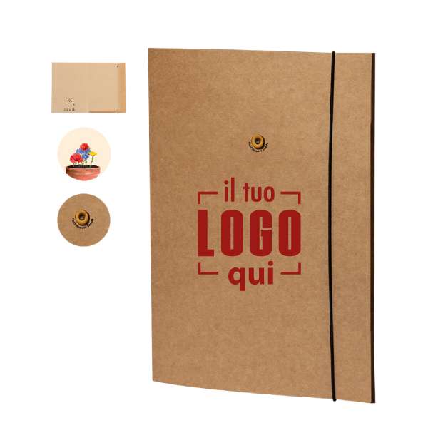 Una cartellina unica che unisce funzionalità ed eco-design. Realizzata in cartone riciclato, presenta una copertina flessibile con chiusura elastica e un pratico interno per conservare documenti. La vera particolarità? Una capsula integrata con semi di fiori selvatici: un piccolo gesto green che fa la differenza.