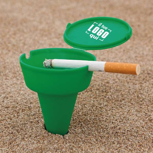 Posacenere da spiaggia in plastica con coperchio. Semplice da impiantare sulla sabbia grazie alla punta conica questo posacenere conterra' i mozziconi di sigaretta senza dispersione con il coperchio di cui e' dotato. Gadget personalizzabile con logo ideale per tutte le attivita' in localita' di mare per omaggi a clienti fumatori.