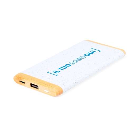 External auxiliary battery made in a combination of bamboo and wheat straw. With 5,000 mAh charging capacity and Type C input/output + USB output connections. With push button and LED charge status indicator, presented in an individual box of eco design in kraft cardboard.Materials such as bamboo encourage the use of natural raw materials, reducing pollutant emissions. It comes from a highly resistant and versatile plant with rapid growth and regeneration, making of it an excellent alternative to traditional wood.Wheat straw promotes the use of natural raw materials, thus reducing pollutant emissions.The capacities shown in all our external auxiliary batteries are real, all of them incorporating non-recycled, grade A batteries, with a service life of at least 500 charging cycles, and complying with CE regulations. In addition, they are manufactured according RoHS standards, and in compliance with the following safety requirements: Power bank overcharge protection system. Complete discharge protection system, which increases the durability of the power bank. Blocking system to prevent short circuits. Constant charging transfer system, in accordance with the capacity of the target device.