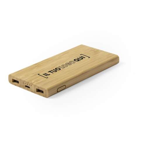 Batteria ausiliaria esterna della linea Nature con caricabatterie wireless integrato. Custodia in bambù dai tagli naturali. Capacità di carica 6.000 mAh e indicatore dello stato di carica. Doppia uscita USB e ingressi di tipo C e Micro USB -cavo incluso-. Ricarica fino a 3 dispositivi contemporaneamente Compatibile con dispositivi dotati di tecnologia di ricarica wireless Ampia superficie di marcatura e presentata in un'attraente scatola di design ecologico. Le capacità mostrate in tutte le nostre batterie ausiliarie esterne sono reali, incorporando tutte batterie di grado A e non riciclate, con una durata utile di almeno 500 cicli di carica e secondo le normative CE. Inoltre, sono fabbricati in conformità con gli standard RoHS e in conformità con i seguenti requisiti di sicurezza: Sistema di protezione da sovraccarico della banca di potenza. Sistema completo di protezione dalle scariche che offre una maggiore durata della power bank. Sistema di bloccaggio per evitare cortocircuiti. Sistema di trasferimento del carico costante, in base alla capacità del dispositivo di destinazione.