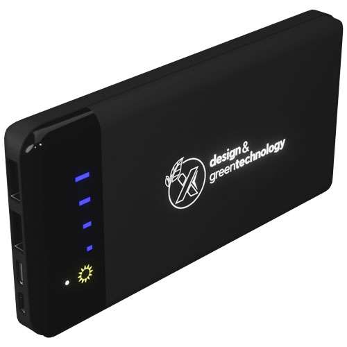 Power bank a energia solare con logo luminoso, con capacità di 8000 mAh, dotato di display digitale che mostra lo stato di carica. Il power bank ha 3 pannelli solari monocristallini rimovibili che fungono da stazione di ricarica fissa e mobile. Il tempo per la ricarica a energia solare in condizioni climatiche perfette è di 16 ore. La ricarica può essere effettuata anche tramite il doppio ingresso USB principale da 2 A. Il logo si illumina quando il power bank viene utilizzato. Fornito con un cavo di ricarica realizzato in PET riciclato. Dimensioni del power bank: 15,4 x 8 x 3,1 cm. Fornito in una confezione regalo di carta kraft riciclata (22,5 x 11 x 4,5 cm) con chiusura magnetica. Garanzia di 3 anni inclusa.