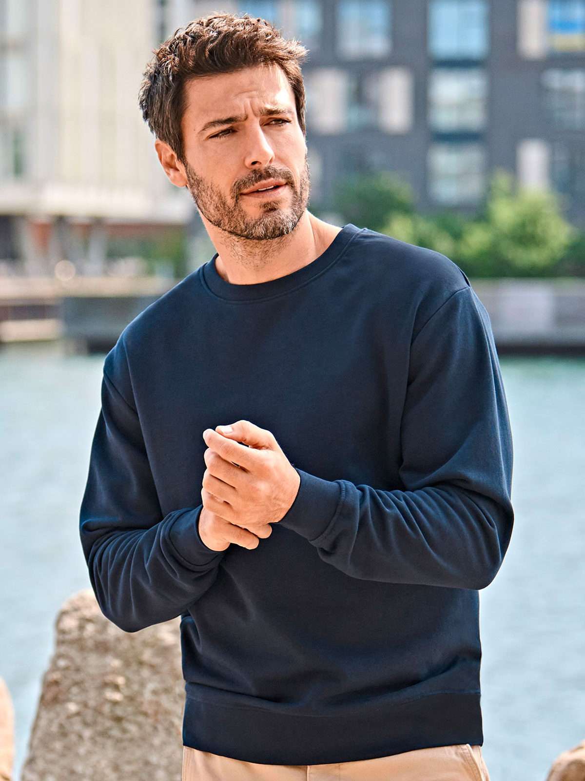 70% cotone organico, 30% poliestere. Felpa girocollo, costine con elastan, felpata internamente, etichetta strappabile sul collo, tessuto liscio e morbido, ideale per stampa e ricamo.