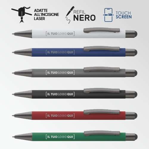 Penna a sfera in metallo dal look sofisticato con finitura satinata opaca e dettagli grigi in metallo. Dotata di meccanismo a scatto e gommino per touch screen, unisce funzionalità e stile. Refill nero incluso per una scrittura fluida. Perfetta per personalizzazioni aziendali moderne.