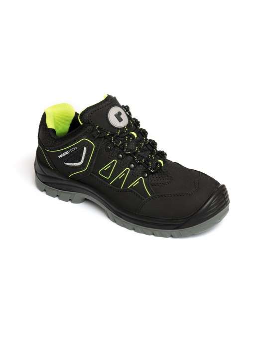 Calzatura bassa effetto nabuk di colore nero, fodera interna di colore nero e verde acido, linguetta imbottita, puntale in composito, lamina non metallica, soletta anatomica, traforata, con tallone antishock, estraibile traspirante e antistatica. Suola in poliuretano bidensità.
