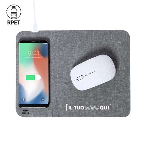 Tappetino mouse in morbido poliestere RPET, realizzato con plastica riciclata per incoraggiare il riutilizzo dei rifiuti di plastica e aiutare la sostenibilità del pianeta. Con base in silicone antiscivolo e poggia polsi imbottito per prevenire stress e dolori articolari. Etichetta RPET stampata.