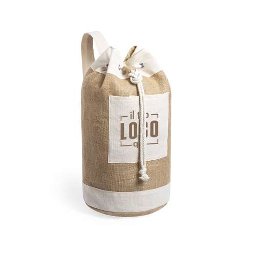 Sacca multiuso della linea Natura dal design bicolore. Realizzata in iuta, con dettagli in cotone. Con tracolla regolabile e tasca interna. Scomparto principale con anelli metallici rinforzati e tasca frontale ideale per la stampa.