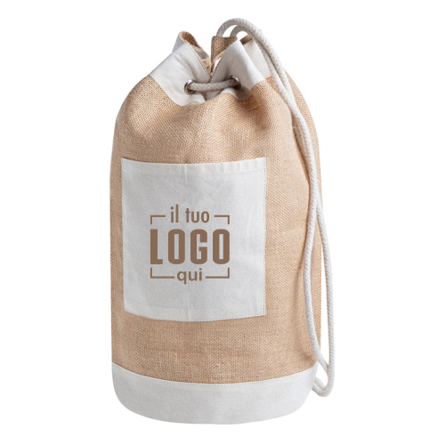 sacca zaino juta e cotone; tasca frontale in cotone; chiusura con corda; Tecnica di stampa consigliata: Serigrafia - Transfer