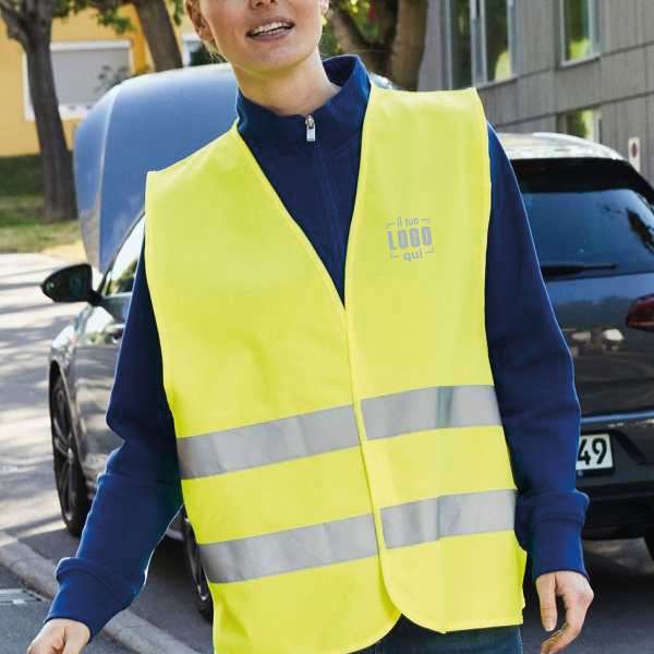 100% poliestere. Gilet di sicurezza per adulti, taglia unica. Bande riflettenti sul davanti e sul retro, Pratica chiusura in velcro. EN ISO 20471 : 2013 classe 2.