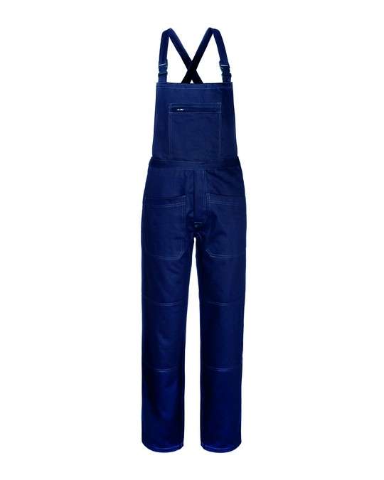 Pettorina da lavoro con chiusura alla patta con bottoni, apertura laterale a destra chiusa con bottone, bretelle incrociate in tessuto con elastico interno e fibbie in plastica. Un tascone applicato al petto chiuso con cerniera, due tasche anteriori applicate, un portametro applicato su gamba destra, una tasca posteriore applicata a destra chiusa con bottone, cuciture a contrasto di colore grigio.