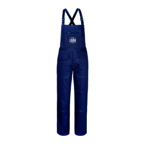 Pettorina da lavoro con chiusura alla patta con bottoni, apertura laterale a destra chiusa con bottone, bretelle incrociate in tessuto con elastico interno e fibbie in plastica. Un tascone applicato al petto chiuso con cerniera, due tasche anteriori applicate, un portametro applicato su gamba destra, una tasca posteriore applicata a destra chiusa con bottone, cuciture a contrasto di colore grigio.