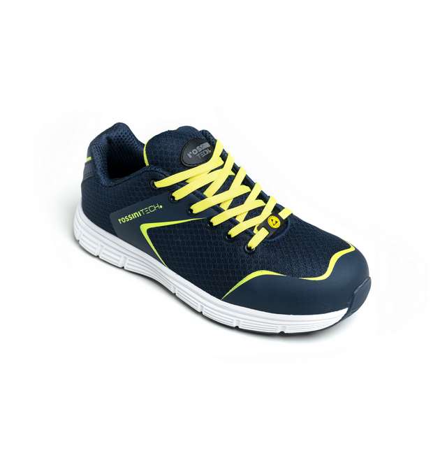 Calzatura bassa dal peso leggero, solo 440 grammi, in esclusivo tessuto alta tenacità traspirante di colore blu con applicazioni di colore giallo fluo. Fodera interna R-DRY antiodore di colore blu e giallo fluo, linguetta imbottita, puntale in fibra di vetro ultralight, lamina antiperforazione non metallica ultralight, soletta anatomica, traforata, con gel antishock sul tallone che assorbe gli urti, estraibile, traspirante ed antistatica. Suola antiscivolo in Eva Ultralight e battistrada in gomma. CALZATURA METAL FREE Calzata 11 Mondo Point